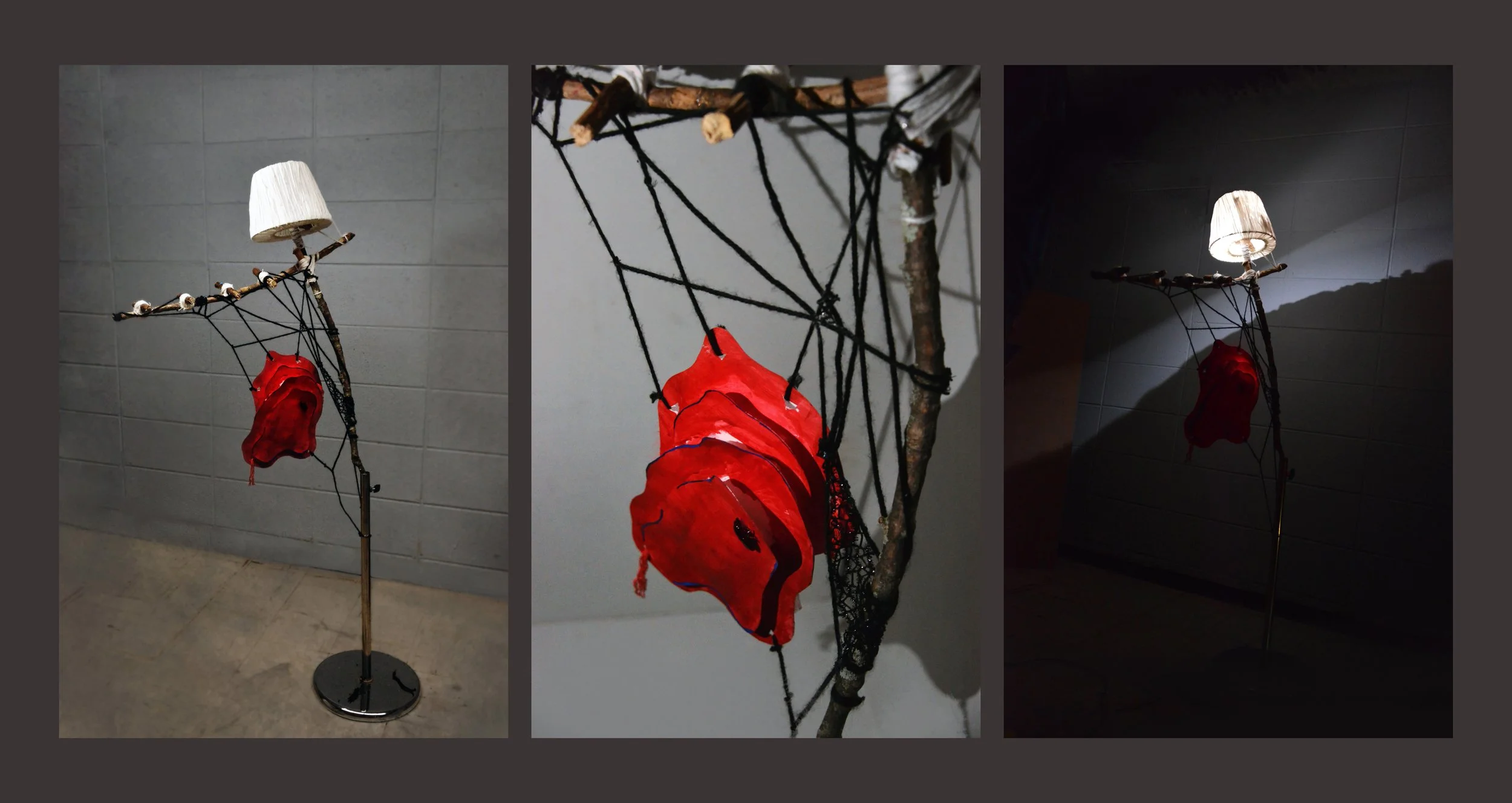 Lampshade, branches, cardboard, wool, mannequin